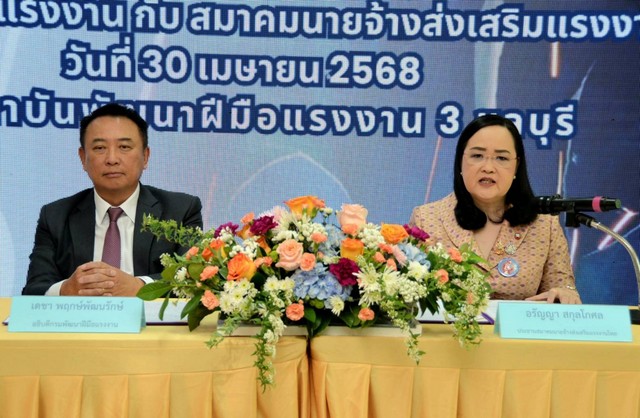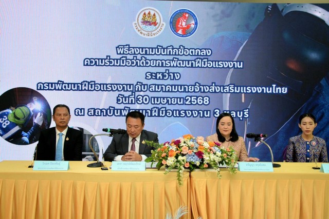 วันที่ 30 เมษายน 2568 กรมพัฒนาฝีมือแรงงาน ร่วมกับ สมาคมนายจ้างส่งเสริมแรงงานไทย พิธีลงนามบันทึกข้อตกลงความร่วมมือว่าด้วยการพัฒนาฝีมือแรงงาน ระหว่างนายเดชา พฤกษ์พัฒนรักษ์ อธิบดีกรมพัฒนาฝีมือแรงงาน นางสาวอรัญญา สกุลโกศล ประธานสมาคมนายจ้างส่งเสริมแรงงานไทย นางเบญจรงค์ สุระพันธ์ กรรมการสมาคมนายจ้างส่งเสริมแรงงานไทย โดยมีนายโกเมศ ปิยะพันธุ์ ผู้ตรวจราชการกรมพัฒนาฝีมือแรงงาน และนางเบญจรงค์ สุระพันธ์ กรรมการสมาคมนายจ้างส่งเสริมแรงงานไทย ร่วมเป็นสักขีพยาน ณ ห้องประชุมอาคารครัวไทย สู่ครัวโลก สถาบันพัฒนาฝีมือแรงงาน 3 ชลบุรี จังหวัดชลบุรี นอกจากนี้ยังเยี่ยมชมและให้กำลังใจผู้เข้ารับการฝึกอบรมหลักสูตรการเชื่อม FCAW 3G และ GTAW 6G(FCAW 3G and GTAW 6G WELDING) อีกด้วย